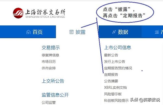 以上海证券交易所网站为例,打开网站,点击“披露”,再点击“定期报告”: