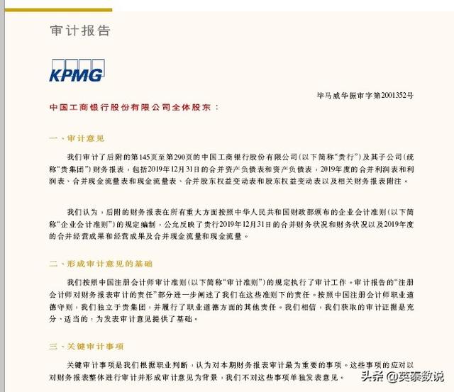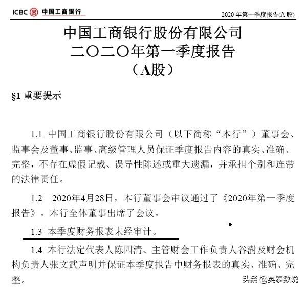 当然有些上市公司的季报可能不包含审计报告,比如中国工商银行股份有限公司2020年第一季度报告不包含审计报告,但是季报上会注明,如下图: