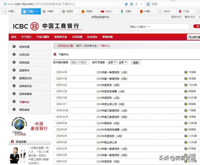 绝大部分上市公司会把年度报告放到公司网站上。如下图就是上市公司中国工商银行股份有限公司各季度和年度报告在公司网站的位置。我们可以看到,有年度报告、年度业绩公告、年度报告摘要和季度报告等,而且分A股和H股。
