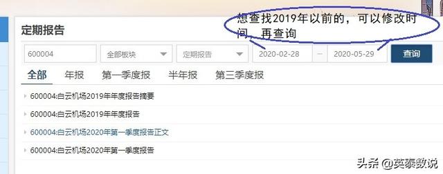 如输入600004,点击查询,出现如下画面,是2019年报和2020年第一季度报告,如果我们像查看较早期别的报告,可以修改起止日期,再进行查询,找到后点击下载查看即可: