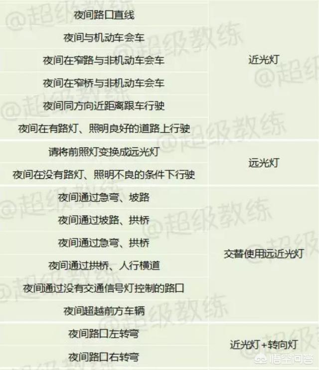 在夜间,起步的时候要开启左转向灯,近光灯。与对面会车的时候,超车的时候,通过弯道,坡路的时候要远近光灯交替使用,最后变回近光灯,千万不要在会车的时候使用远光灯,被远光灯照射相当于盲开,两车之间的盲区也特别大!相当危险⚠️