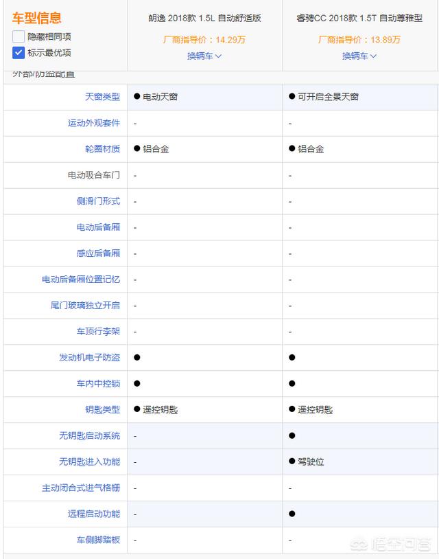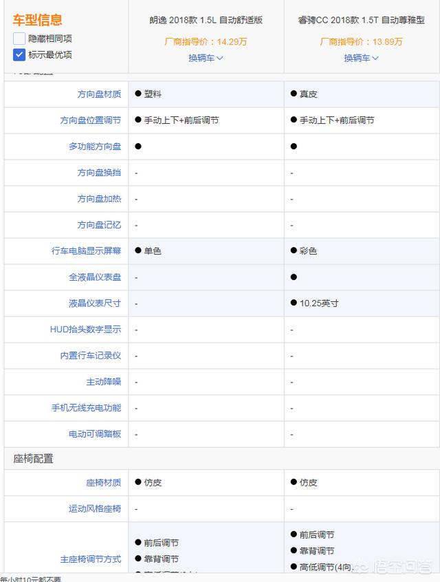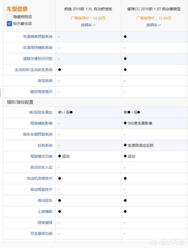睿骋CC的配置要比朗逸丰富一些,尤其是在多媒体配置上还是自主品牌更懂国人,不过新款朗逸全系配备了LED远近光灯、全车一键升降、车窗防夹手、防紫外线玻璃等要比睿聘CC良心很多。