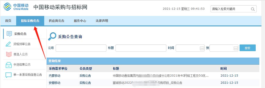 有些大型企业官网会有招投标栏目或者是自建的招采平台,有时候会在上面发布一些招标采购信息,提供给供应商查看,不过数据不多;比如中国移动