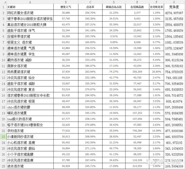 接着我们就可以筛选了,这里我可以教大家一个简单方便的筛选公式,用“竞争度”来进行数据筛选,竞争度=搜索人气*点击率*转化率/在线商品数*10000。(乘以10000只是为了放大数值好观察,没有别的意义,否则每个数值都会是0.0001123,很难受)