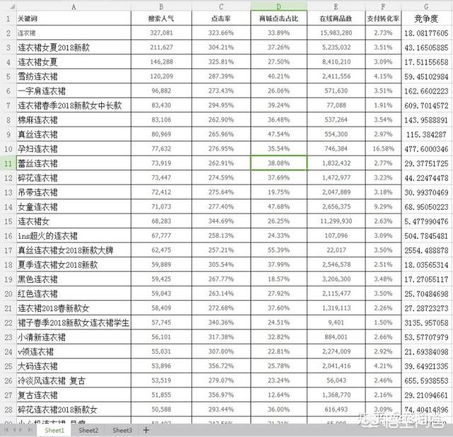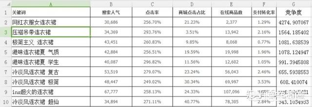 然后同样的方法,我们再用“连衣裙”去搜索筛选。最终得出这张表格,