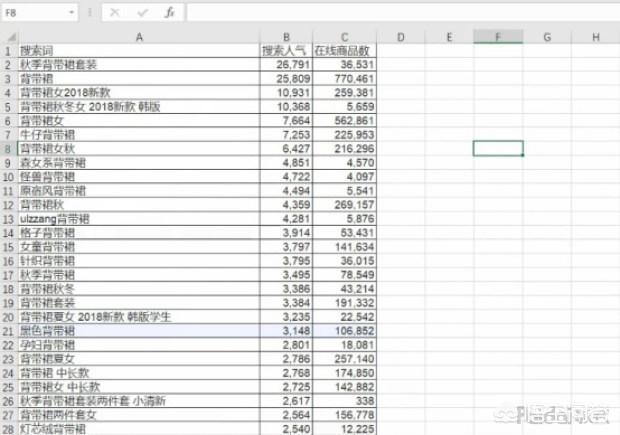 以上的表格内容,结合自己产品的特点,进行再次筛选,像这种“怪兽背带裙”“ulzzang背带裙”“女童背带裙”等带有品牌或与目标人群不符的,显然是要删掉的。
