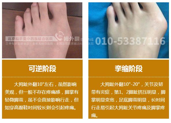 拇外翻常呈对称性,拇趾的跖趾关节轻度半脱位,内侧关节囊附着处因有牵拉,可有骨赘形成,第1跖骨头的突出部分,因长期受鞋帮的摩擦局部皮肤增厚,并可在该处皮下产生滑囊,如红肿发炎,则成为拇滑囊炎,严重者拇趾的跖趾关节可产生骨关节炎,引起疼痛。第二,三跖骨头跖面皮肤因负担加重,形成胼胝.第二趾近侧趾骨间关节处背侧皮肤因与鞋帮摩擦可形成胼胝或鸡眼.
