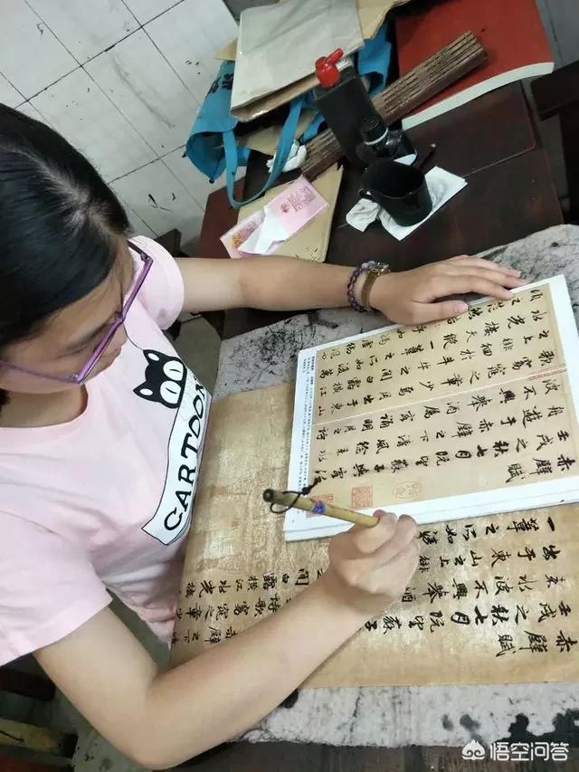 如果是临写小字,字帖放置得太远,精细的地方就不能观察仔细。字帖就不能如上所述的地方。应该平放在左侧桌面上。小字的书写,不会像大字一样的频繁挪动纸面,字帖放在纸面上也不会造成太大的麻烦。而对于细致的观察字帖,却是非常的便利。