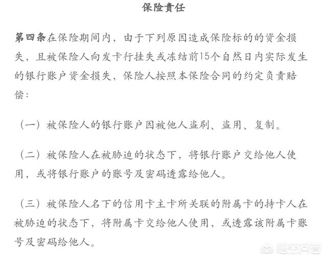 保险内容里面写的很清楚。被保险人在被胁迫的状况下,将银行账户交给他人使用,或将银行账户的账号及密码透露给他人。这些都是在保险范围之内的。