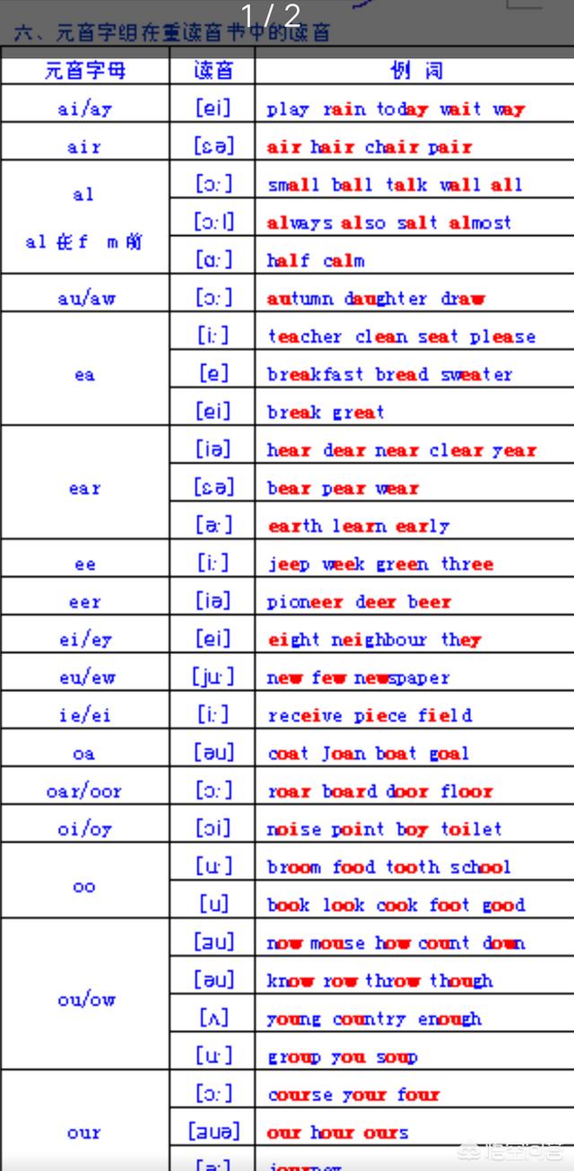 2.英语主要是三个方面的:单词,语法,语感。你要能把所有学过的单词全部背起来,还有语法例句背好,这样你的基础就算有了,然后你再跟着老师大量刷题,就差不多了。另外提一点你语音音节要过关。这样背单词会很轻松比如were这个词后面ere是一个读音,然后你一读到就可以马上拼读出来。给你几个表看看。