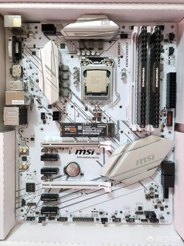 这里搭配一块ATX的标准型主板,B360 GAMING ARCTIC 极地主板,正如名字一样采用黑白色搭配,四条内存插槽支持双通道DDR4 2666内存,搭配一条NVME M.2高速SSD接口,主板整体颜值还是挺不错的。