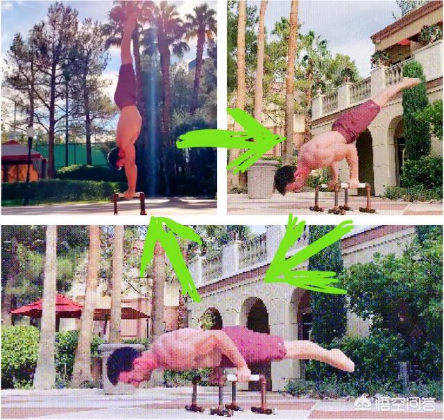 因为俯卧撑中身体有双脚接触地面,身体非常稳定,只需要发挥推力即可完成。而真正90度倒立撑最低点时双脚是腾空的,也就是曲臂水平支撑,这需要更强大的肩部力量与核心控制力。
