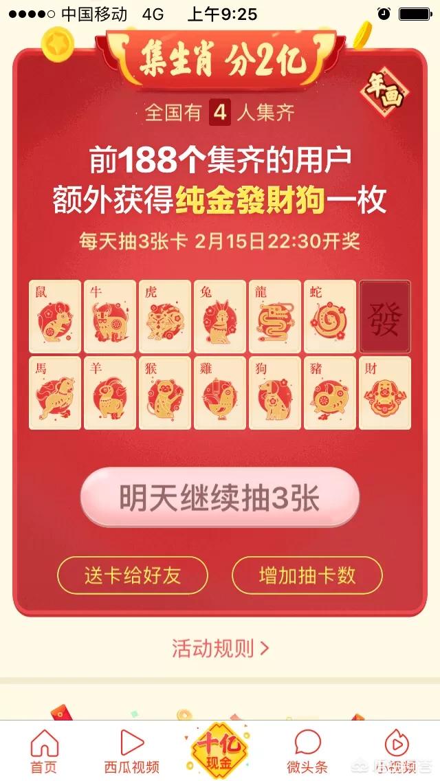 要,要,要,切克闹 ,发狗财狗来一套。从8号0点,开始参与活动,通过分享,邀请好友,参与新农商网,第一天就凑齐了13张生肖卡,缺什么卡?对了,和大多数朋友一样少一个發。很喜欢这样的活动,活跃度高,前188名凑齐生肖卡还有纯金發财狗的额外奖励,大大提高了网友集卡的积极性。今年是本命年如果能得到来自新农商网的祝福(發财狗)就更好了。最后感谢头条出了这么多的惠民活动,红包雨和百万答题都能得到不少现金。