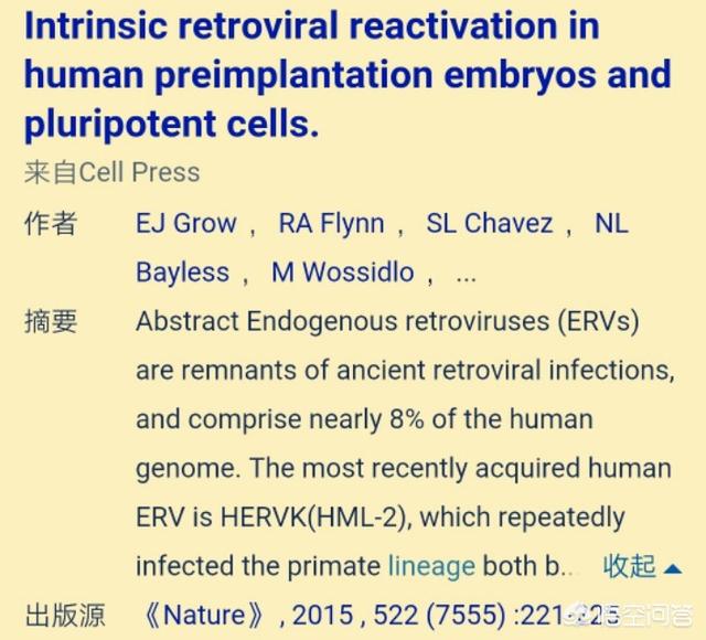 人类基因组中编码序列大约有1-2%,而已知来自ERV的系列大约有8%,只不过大部分插入人类DNA中的片段已经不能再表达出病毒了。在2015年《Nature》的文章中,见下图,有科研人员发现了还具有活性的ERV,就是下图中所说的HERVK(HML-2),他们发现了HERVK在人胚胎期时会进行表达,而且会产生包装的毒粒(VLP),不过没有弄明白此病毒的致病性和相关情况。