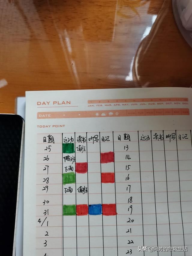 入坑第六步:我将生活中重点要做的事情,如跑步,听英语,写日记等,我会偷懒,因此我建立了打卡本。