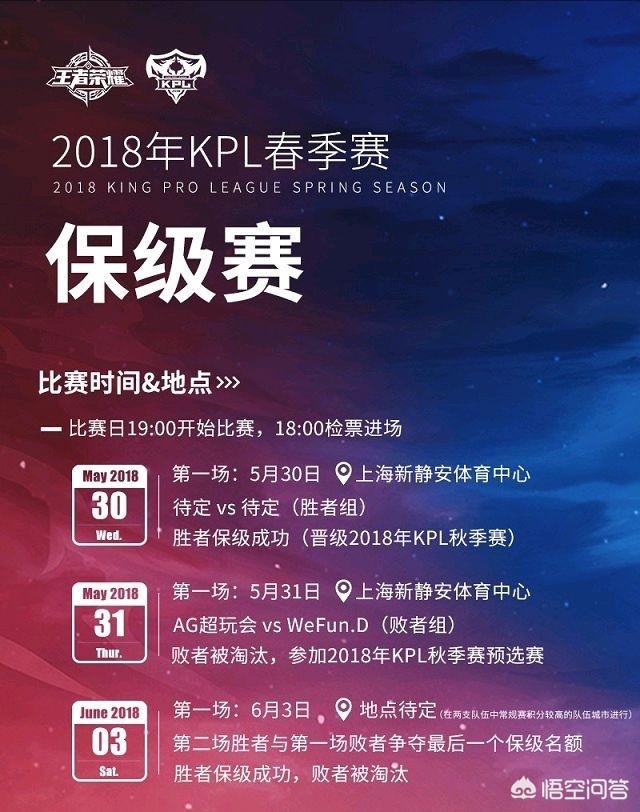 保级赛比赛时间:5月30号的是胜者组的比赛(QGhappy和YTG),5月31号的是败者组的比赛(AG超玩会和WF.D),6月3号最后一场(比赛双方待定)。