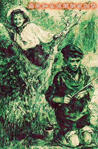 冬妮亚在池塘边看书散步时,发现“一个黝黑的、赤足的孩子”。她并没因对方衣服槛褛、满身泥垢、言语粗野而有丝毫的鄙视,而是怀着一颗晶莹的童心,友好的与他交谈。