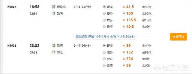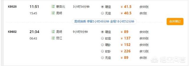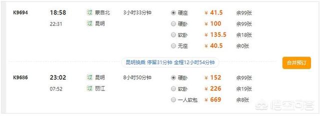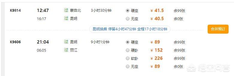 以上是从所有方案中截取的其中几个,最终在不考虑时间因素的情况下,我们选择乘坐K9814次列车到达昆明,在昆明无缝换乘K9606次列车,次日早晨6点到达丽江,在车上睡一觉可以缓解一天赶车、换乘的疲惫,这一趟的花费是130.5元。