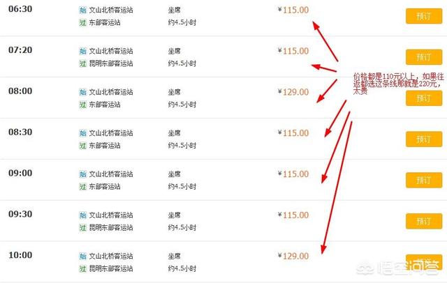 从文山出发,到达丽江,无论怎么走,去昆明中转应该是比较便捷的。但我们必须放弃包车、顺风车、大巴、飞机等一切价格高于火车出行的交通方式,总的来说就是越便宜越好。下图请看,文山到昆明的直达班车虽然运行时间短,但是贵,全都是单程110元以上,想都不想就放弃 。