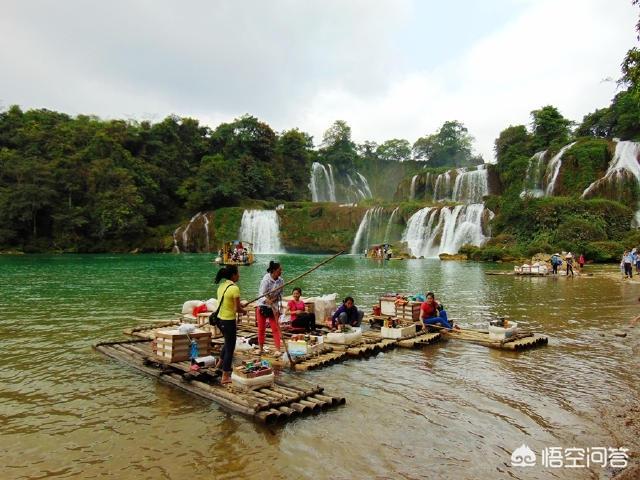 德天跨国大瀑布位于广西和越南交界处,撑船的都是越南卖特产的人