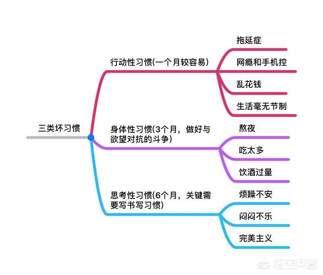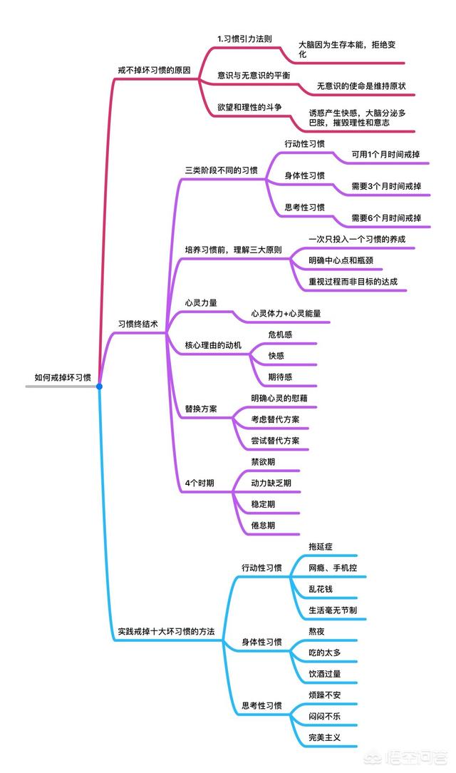 不论是哪一类坏习惯,总结起来它们的方法都是一样的。1、习惯性行动:每天进行,把坏习惯转化成好习惯的一个点块。坚持下去,目的性是把意识变为无意识。如乱花钱,那么规定自己每天带多少钱,并且不能超出这个范围。2、做好和欲望斗争的准备:(1)提升心理承受力(2)给自己设定必须戒掉这个坏习惯的理由(3)设定替代方案:例如控制不住想吃零食的时候,可以看书或者追电视剧引开注意力3、用习惯终结术给四个时期设定好计划就像戒掉网瘾和手机控一样,先找到可以让自己沉浸其中的替代性爱好。如果喜欢阅读书籍,那么就可以用阅读代替手机上网。其次就是限制玩手机上网的时间和时机,每天规定一部分时间给自己上网玩手机用,但不可以太多。同时,如果手机上有什么吸引自己非用不可的软件,那就卸载掉,这是为了制造一个好的环境。进行的时候为了看到进步,清楚地知道自己处于什么时期,可以指定一张可视化表格,把自己的行为记录下来。一个拥有好习惯的人势必会比有一堆坏习惯的人优秀自信、讨人喜欢!戒掉第一个坏习惯或许很难,但是坚持下去,成功以后,会发现先成功其实离自己很近。那么之后的一堆坏习惯都可以成功的戒掉,到那时,会明白,戒掉坏习惯就是把自己变得优秀,成为一个优秀的人!