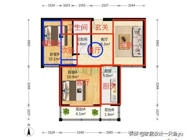 - 入户右手边做卫生间,原卫生间借用次卧1米的位置,保证卫生间的使用。
