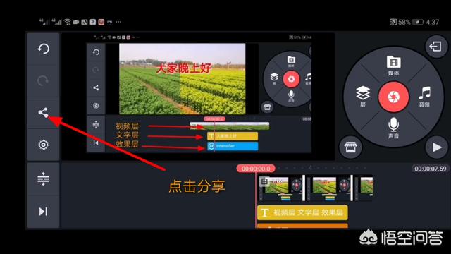 预览后,要导出视频,我们先返回,可以点击右上角的返回键。然后点击视频,点击分享符号,如图那样子就可以导出视频。