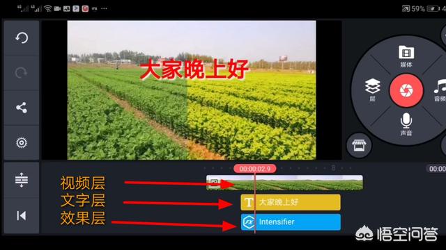 然后,添加背景层,文字层。先选中视频一变成黄色,然后点击层那里。背景图片白色,右侧的选择透明度。然后在预览窗口那里选择显示的位置,大小。 接着点击下面的背景层那里左右拖动可以试着它显示的时间。 以此类推选择视频点击层那里就可以添加文字层。 最后添加音乐层,加入背景音乐。