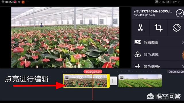 进去界面后,添加两个视频,可以看到两个视频中间有个白色的方块,这个可以叫做转场,转换镜头。如果都不设置那么从第一个视频立马就会跳到第二视频。 这里我们先点击第一个视频,选择视频后颜色会变成黄色。表示选中视频操作。 可以调节视频的颜色啊特效等等快慢啊等等内容,根据你的需要调整。