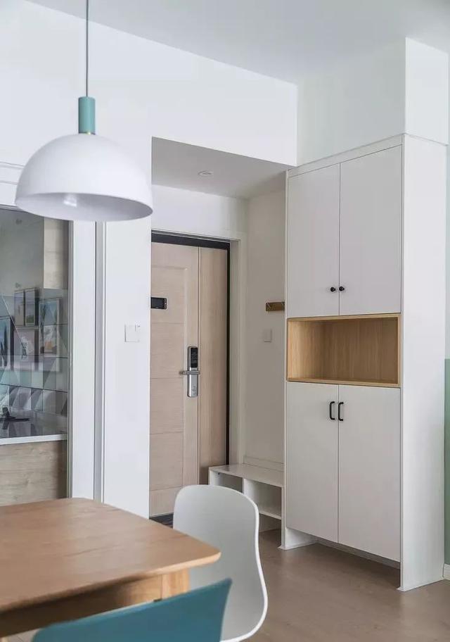 1、入户区:没有明确的鞋柜位置,如果鞋柜设计在入户左边,空间比较小,只能坐超薄鞋柜。如果在入户右侧,需要离开入户门一点距离再做标准深度的鞋柜,才不会阻挡入户的通道空间。