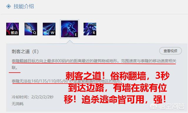泰隆在国服还有一个更知名的称号:男刀。这也是区别于女刀锋(刀锋意志——艾瑞利亚)的叫法。男刀这个英雄的游走能力极强,是属于开头说的能频繁使用位移技能的英雄。男刀80%的游走能力,来源于他的E技能-【刺客之道】,俗称翻墙。