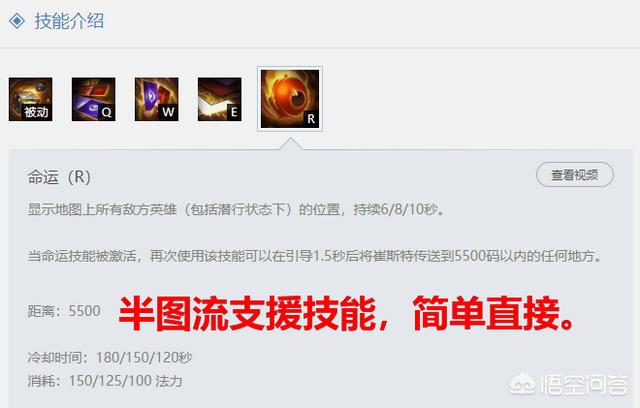 卡牌的游走能力来源于自己的R技能-【命运】,开启后可以传送到目标位置。这个技能准确的说并不是“全图”,但是在中路的卡牌,R技能的辐射范围可以覆盖己方的上下两路,最自己家来说,也算是全图了。