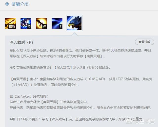 R技能-【深入敌后】,开启后人鸟合一,获得100%移速加成。这个移动速度是恐怖的,说到游走能力,奎因当然不输任何人。但是这个英雄也存在极大的短板,那就是身板脆,怕控制。并且这个“人鸟合一”的状态很容易被打断。所以使用的玩家不多。
