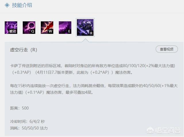 如图所示,卡萨丁的R技能冷却时间很短。在自己蓝量充足的情况下卡萨丁拥有无限的位移。另外【虚空行走】的伤害叠加原理,让他成为游走收益最高的英雄之一。叠满四层R技能之后,基本上REWQ就能带走一只ADC。