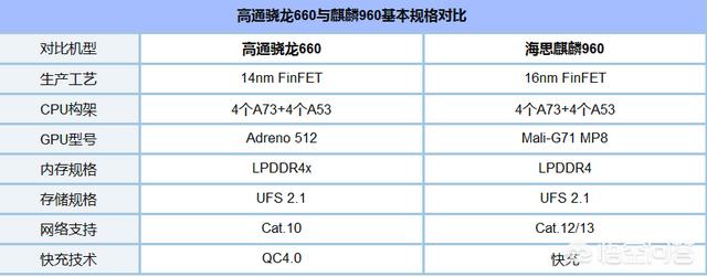 就基本参数而言,相比高通骁龙660,麒麟960在工艺方面落后一些,但在网络制式方面存在明显优势。