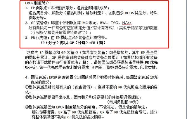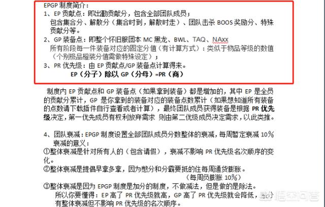 很多玩家对EPGP不太了解,甚至一看到EPGP那套算法就觉得头大,其实EPGP的分配方式非常简单,就是用出勤率除装备分得到优先点数,谁的点数最大,谁可以优先拿装备,举个简单的例子,两名玩家都是100分的出勤分,一个拿了件30分的极品装备,而另外一个拿了件20分的普通装备,100除30=3.33,100除20=5,那么拥有5分的玩家就可以获得优先拿下一件装备的权力。