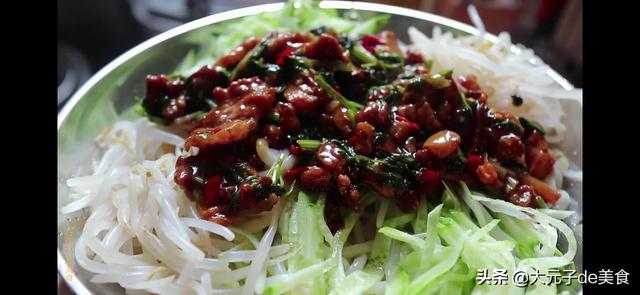 10.准备豆芽焯熟,黄瓜切丝,胡萝卜切丝摆在面条上,倒入肉酱就可以开吃啦