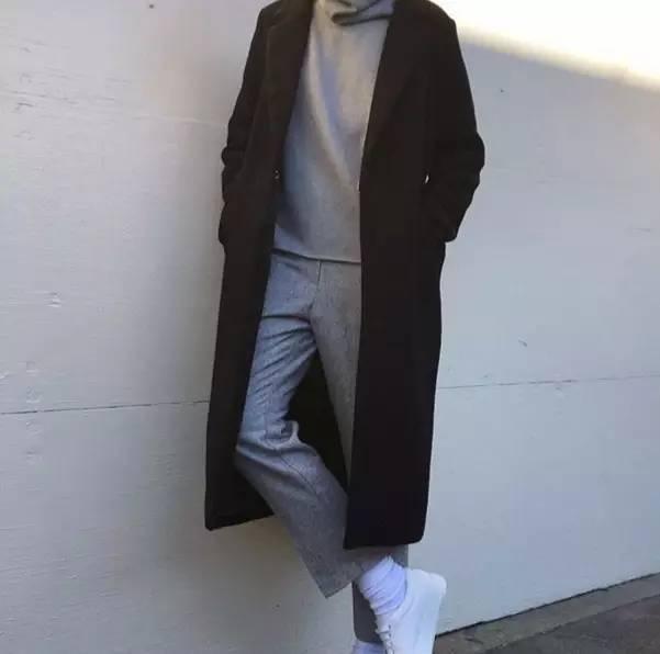黑灰色长外套,款式简洁随性。带羊绒的材质也比较保暖。