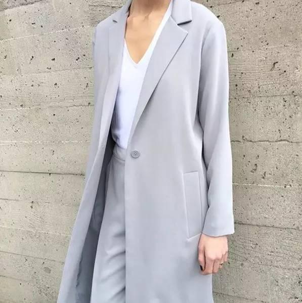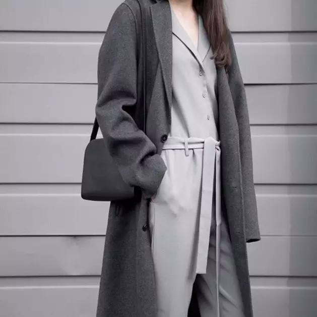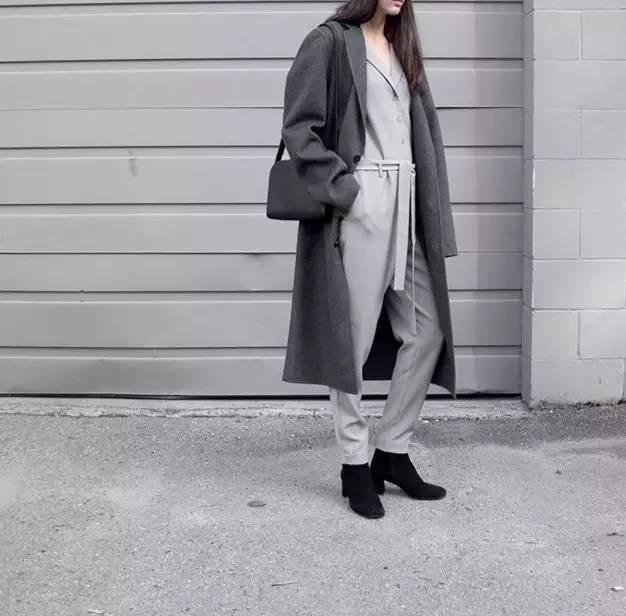 深灰外套内搭浅灰连衣裤,形成了一个渐变的风格,看上去也不咄咄逼人,很率性。
