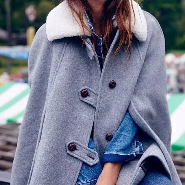 带毛领的斗篷式外套,搭配格子衫和短靴走一波学院风。