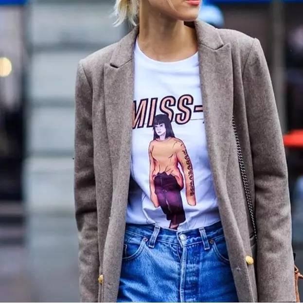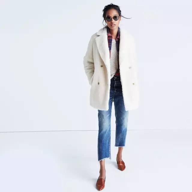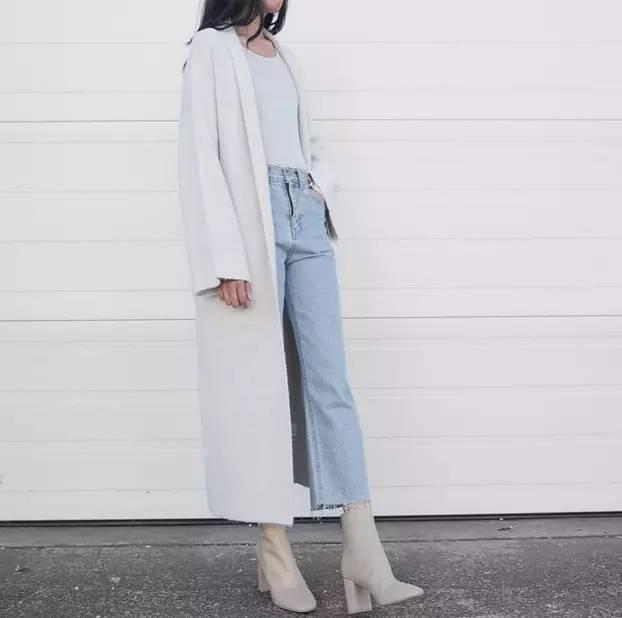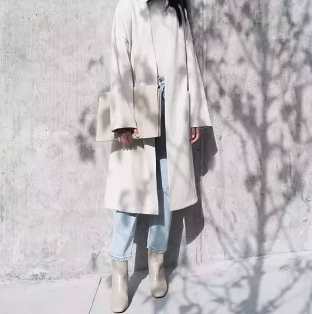 纯白色大衣配上水洗蓝mom jeans和同色系短靴,优雅大方。