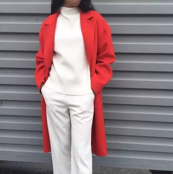难得有亮色系。正红色外套,搭配白色很洋气。