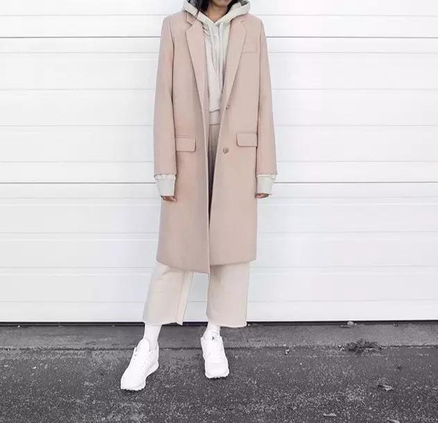 一件浅驼色大衣,内搭连帽卫衣和阔腿裤走休闲风。