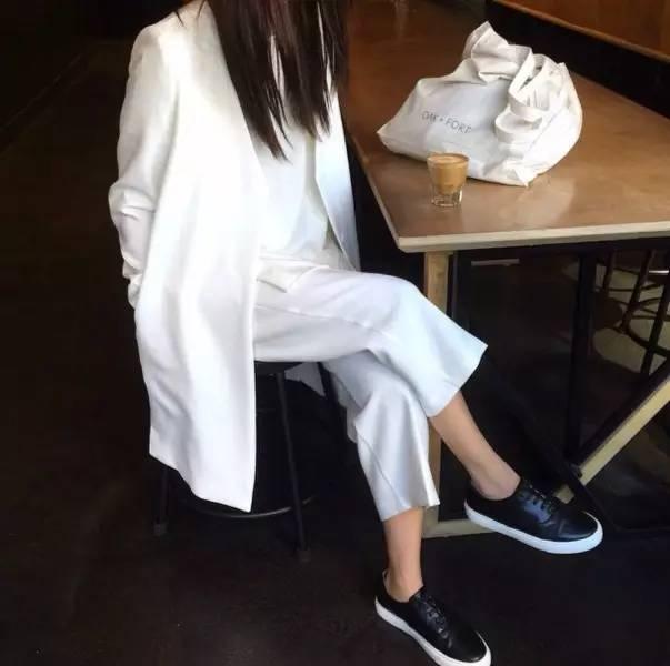 纯白look搭配一双小黑鞋,经典的黑白配。