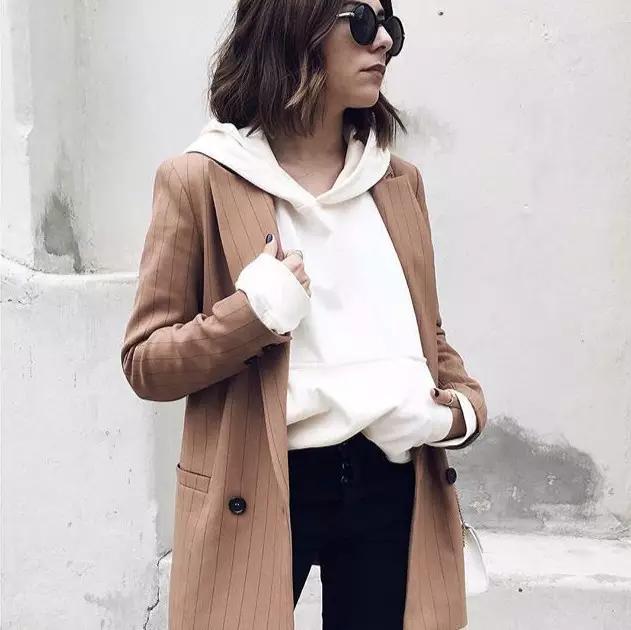 这件竖条纹卡其色西装外套,带点学院风,又带点OL风,很百搭。
