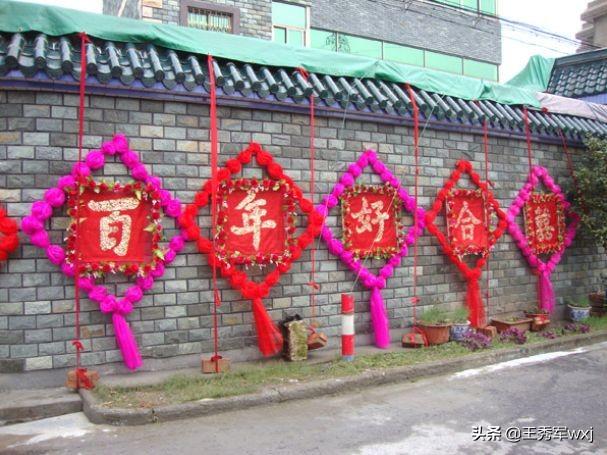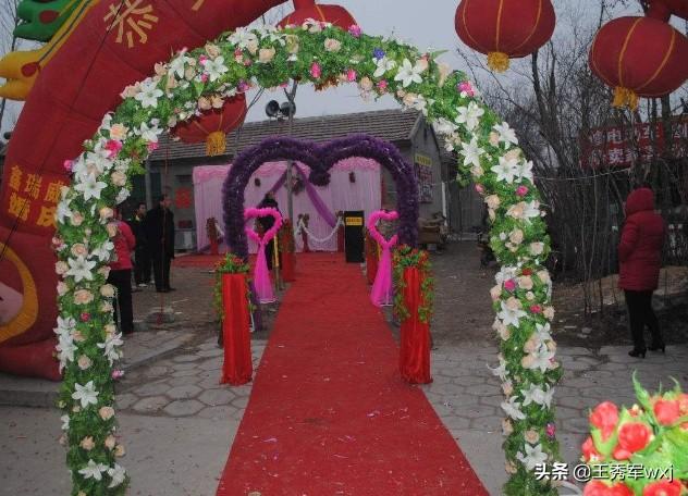 农村婚礼现场布置比较重视屋外的布置。因为农村基本上家家户户都有大院子,而请客摆喜酒也都是在屋外进行的。