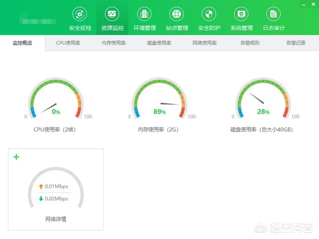 在功能上,分为安全巡检、资源监控、环境管理、站点管理、安全防护、系统管理、日志审计八大模块,日常的管理一般是使用安全巡检以及资源监控,其中一键安全巡检和一键修复功能适用于服务器定期的体检,有什么问题可以及时解决,而资源监控的告警规则我觉得十分有用,当手上需要管理的服务器真的过多时,为每台服务器的资源使用状况添加告警规则,一旦超出自己规定的限定值就会通知告警,不必时时守着监控查看,大大挺高了运维的工作效率。
