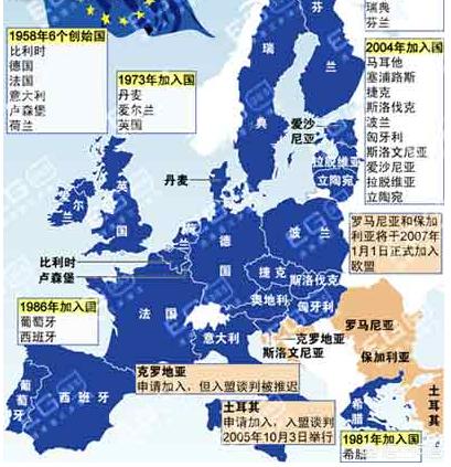 “欧共体”成立伊始,曾经拉英国入伙的,但是英国议会那帮老爷们,一方面是岛国“光荣孤立”的思想(老美也曾有这种思想,以致于二战迟迟不肯打仗),另一个方面就是怕没有利益,吃亏,没有马上加入。直到“欧洲煤和钢铁共同体”蛋糕越做越大,英国人一看有好处,就加入了。