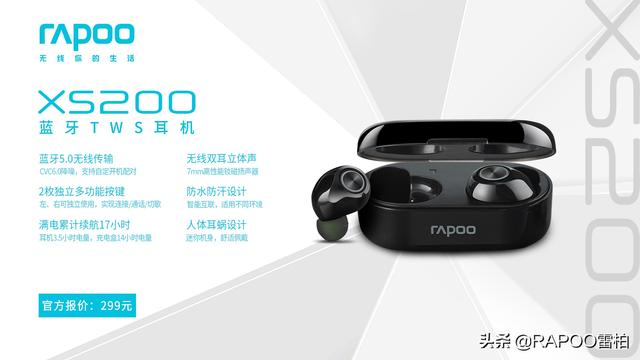 推荐一款我们家的XS200蓝牙TWS耳机,再说说我们家的这款TWS蓝牙耳机的一些基本性能吧,这款用的是蓝牙5.0的芯片,这能保证更稳定的连接,不容易断开,当然功耗方面也会更低,会有更长的续航时间。单颗耳机只有4.5g的重量,更小巧,更便捷,人体的耳郭设计以及三角的稳定支撑设计,更符合人体工学,佩戴起来更加舒适。可以通过以下的图片对这款蓝牙TWS耳机有初步的了解。