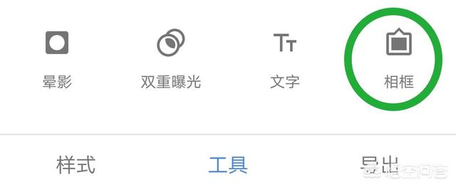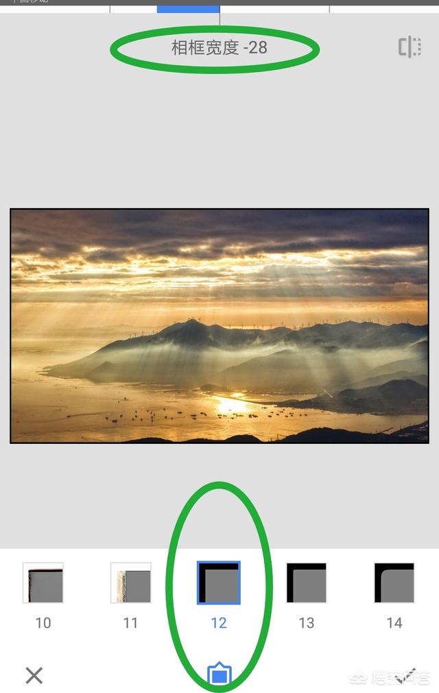2、点击Snapseed工具,在工具中找到相框,选择相框工具中的第12个相框,手指在图片上向左滑动,为耶稣光底图做一个窄一点的边框。